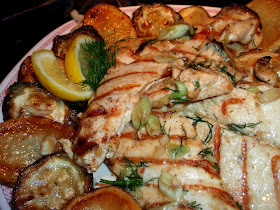 Recipe courtesy of:Peter Francis BattagliaChicken marinated in lemon juice, extra virgin olive oil, white wine, dill, salt, pepper, garlic,..then grilled...plated with pan fried potato and zucchini rounds with garlic and allspice...garnished with fresh lemon, sea salt, black pepper, fresh dill and sliced green onions.